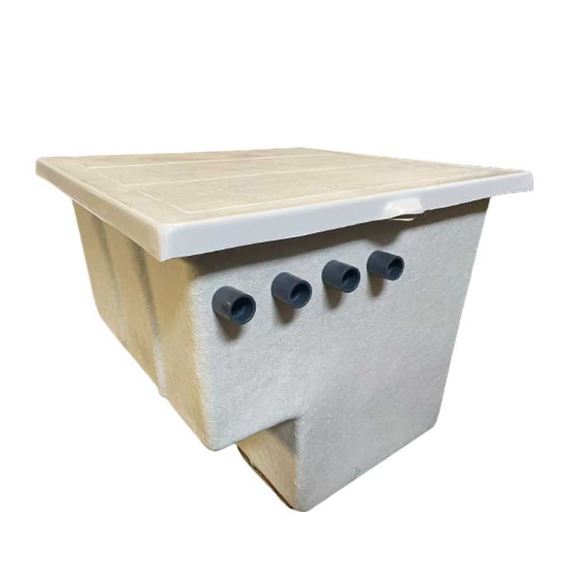 Caseta enterrada de poliéster reforzado con fibra de vidrio y capa de gel coat, y tapa con bisagras de acero inoxidable. Esta caseta está equipada con el filtro de poliéster laminado modelo Bunker Ø500 y la bomba autoaspirante modelo Trypower 0,75 cv. Incluye 5 salidas con válvula de bola, 1 salida para la impulsión, 3 salidas para la aspiración y 1 salida para el desagüe.