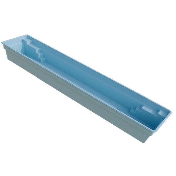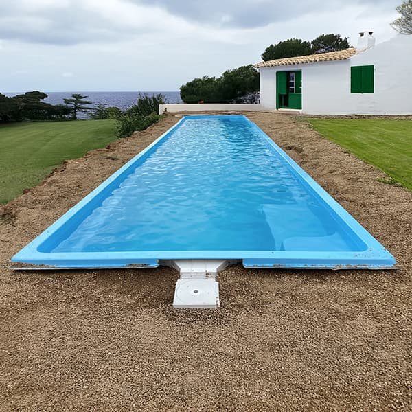 Piscina de poliéster rectangular tipo carril de nado con escaleras en la esquina inferior izquierda para entrar y salir de la piscina.