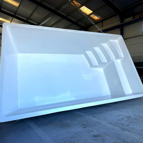 Piscina poliéster rectangular reforzada para instalar elevada con banco y escaleras poliester de acceso.
